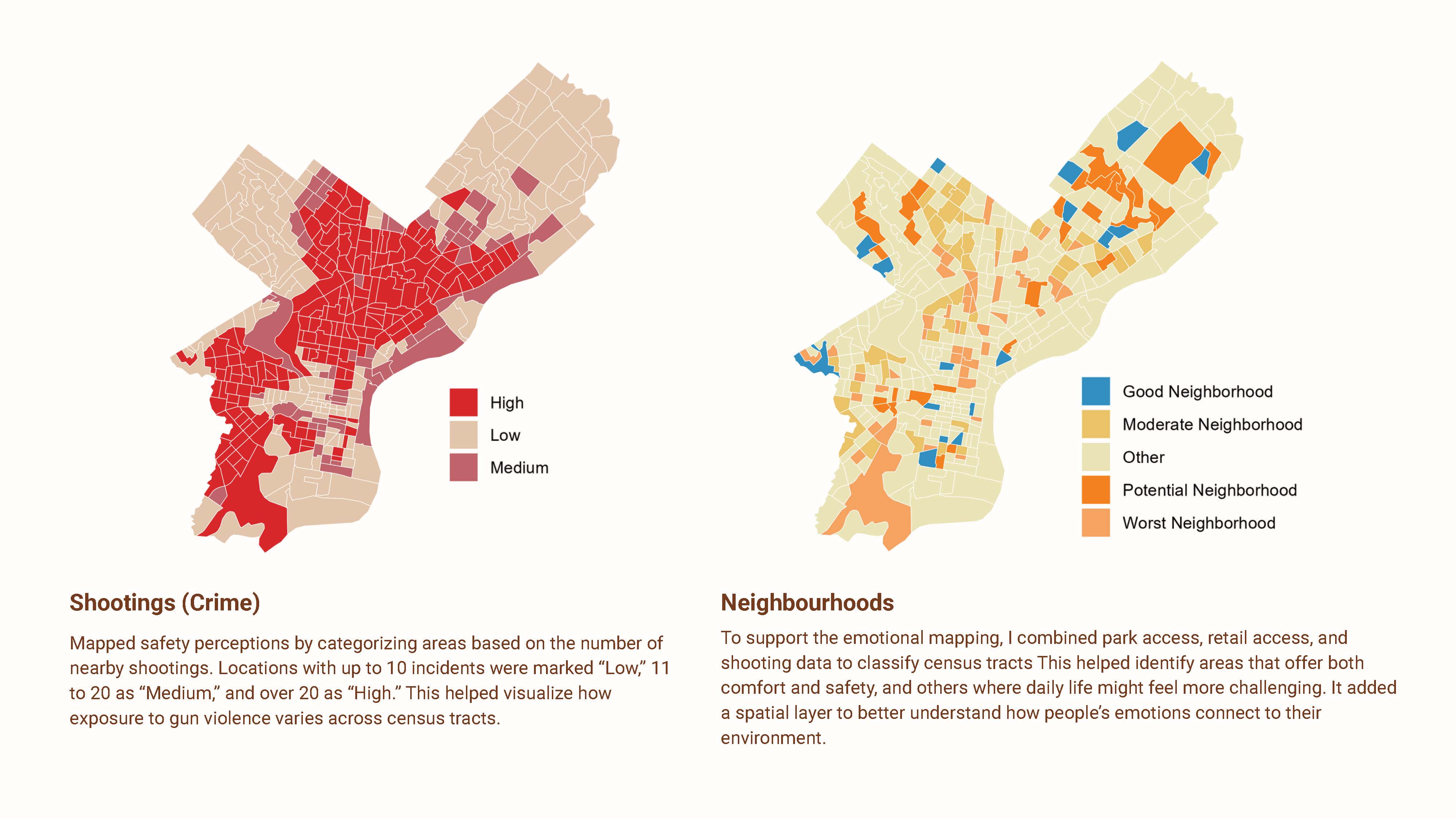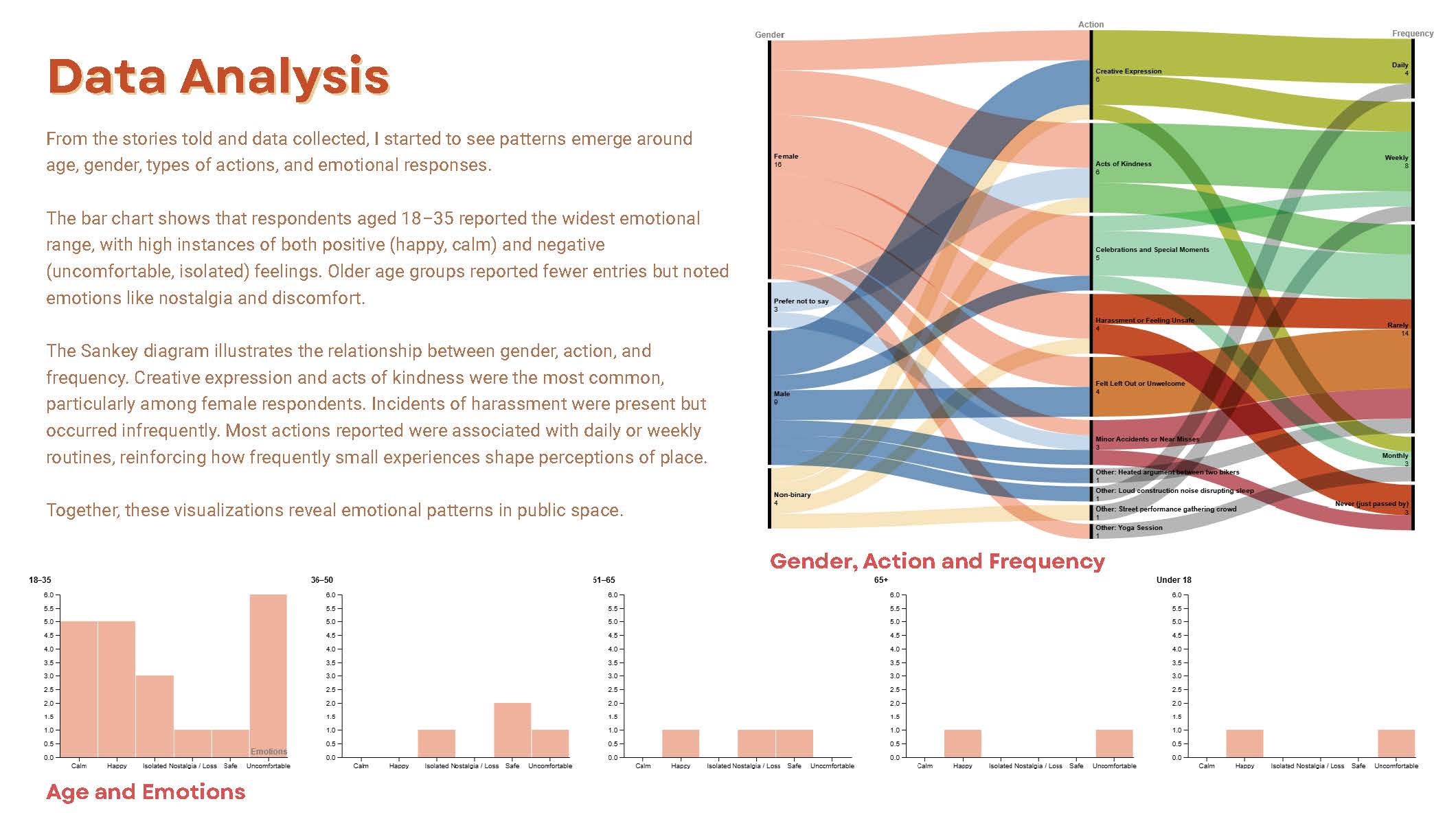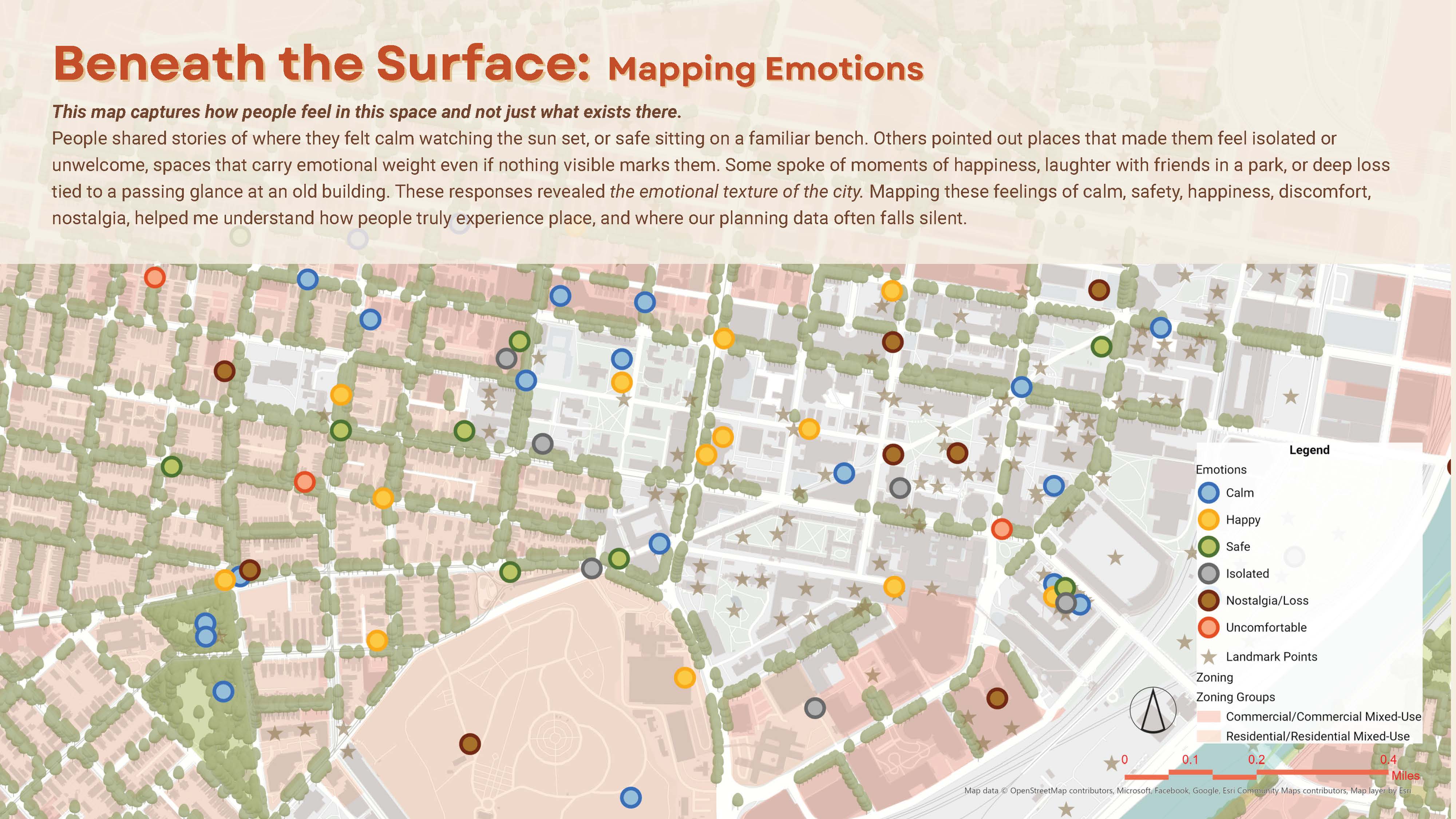 This project demonstrates that emotional experience is not abstract — it follows infrastructure. Areas with limited park access, weaker retail presence, and higher safety exposure showed higher concentrations of discomfort and isolation. Well-connected public spaces revealed patterns of routine engagement, calm, and creative expression.