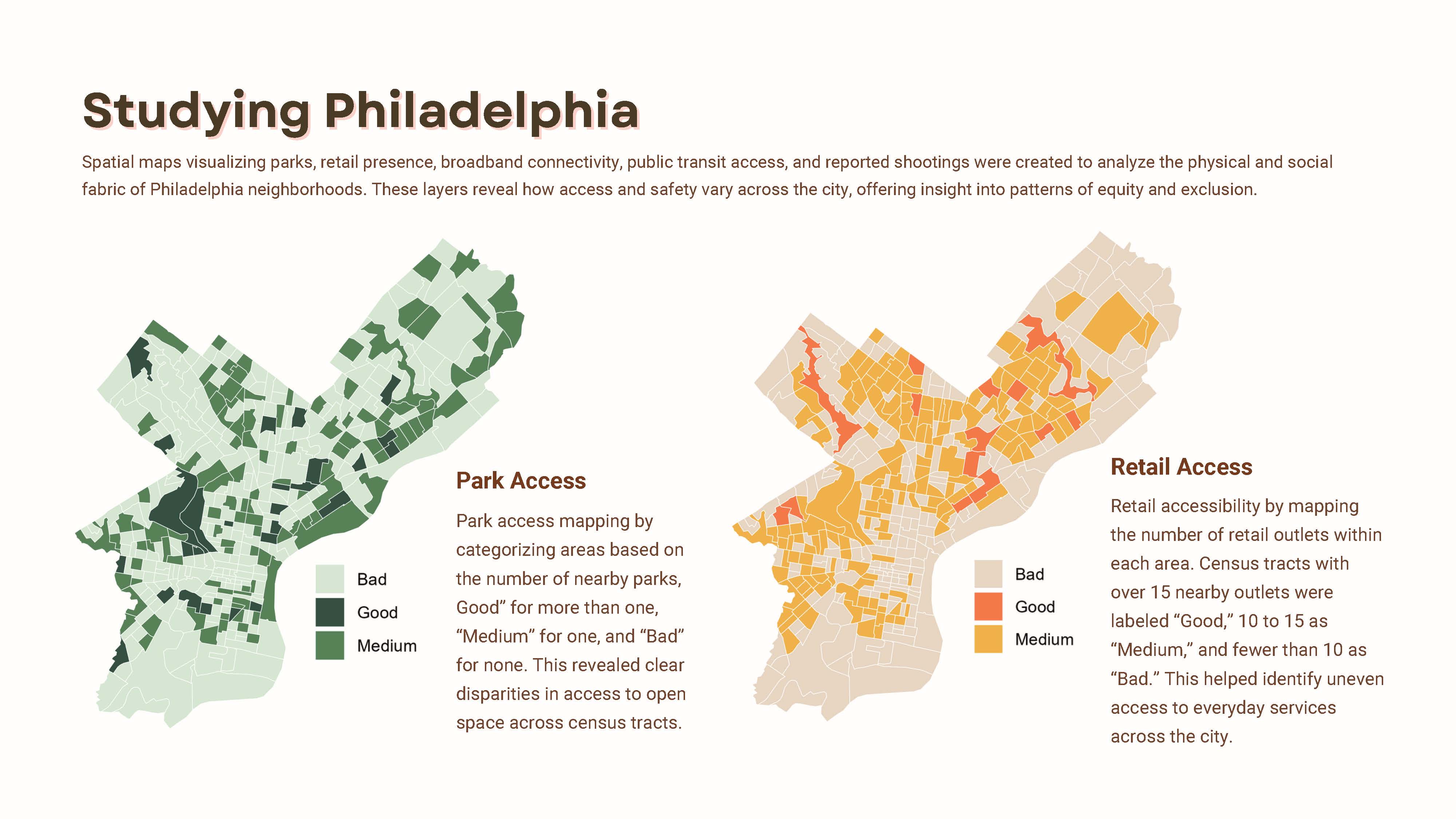The project began by constructing a quantitative spatial baseline. Using R, QGIS, and ArcGIS, I analyzed park access (proximity thresholds), retail concentration, shooting exposure, broadband and device distribution, and transit connectivity. These layers established the structural conditions under which everyday experience unfolds — revealing inequities in safety, access, and connectivity across census tracts.