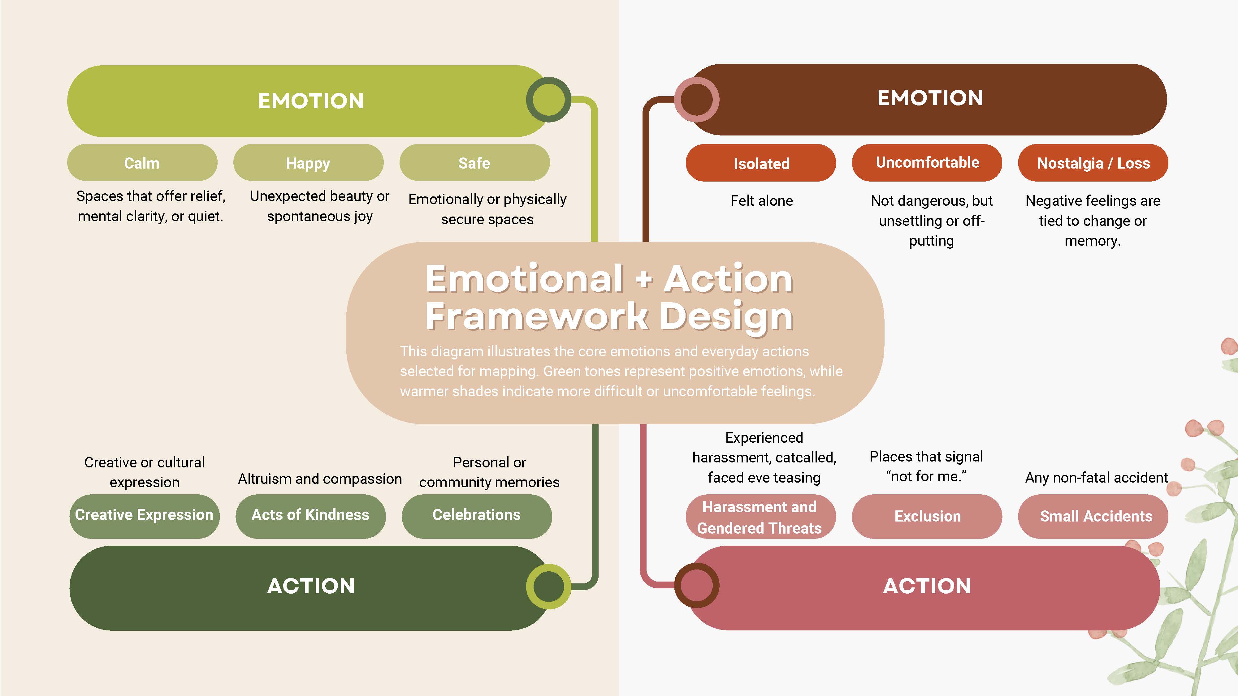 To prevent emotional data from becoming unstructured narrative, I developed a formal taxonomy linking defined emotional states (calm, safe, isolated, uncomfortable, nostalgic) with everyday actions such as creative expression, acts of kindness, harassment experiences, celebrations, and routine use.