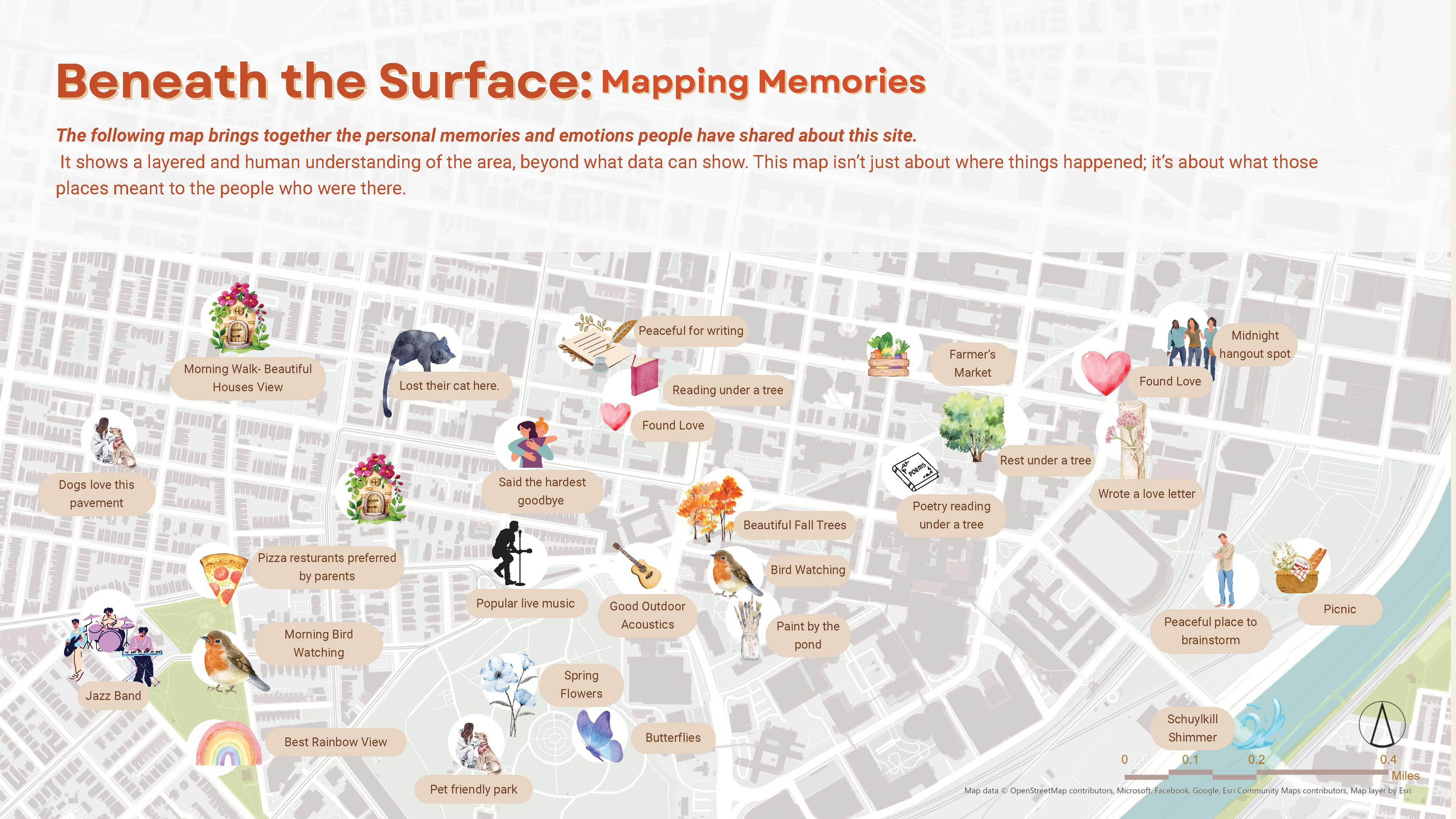 University City was selected for its density, mixed land use, institutional presence, and transit connectivity. Its layered infrastructure and demographic diversity created an ideal environment to test how structural conditions shape lived perception. The work moved deliberately from theory to implementation — grounding itself in “Soft City” scholarship and public life research before developing a spatial and participatory framework capable of generating structured emotional datasets.